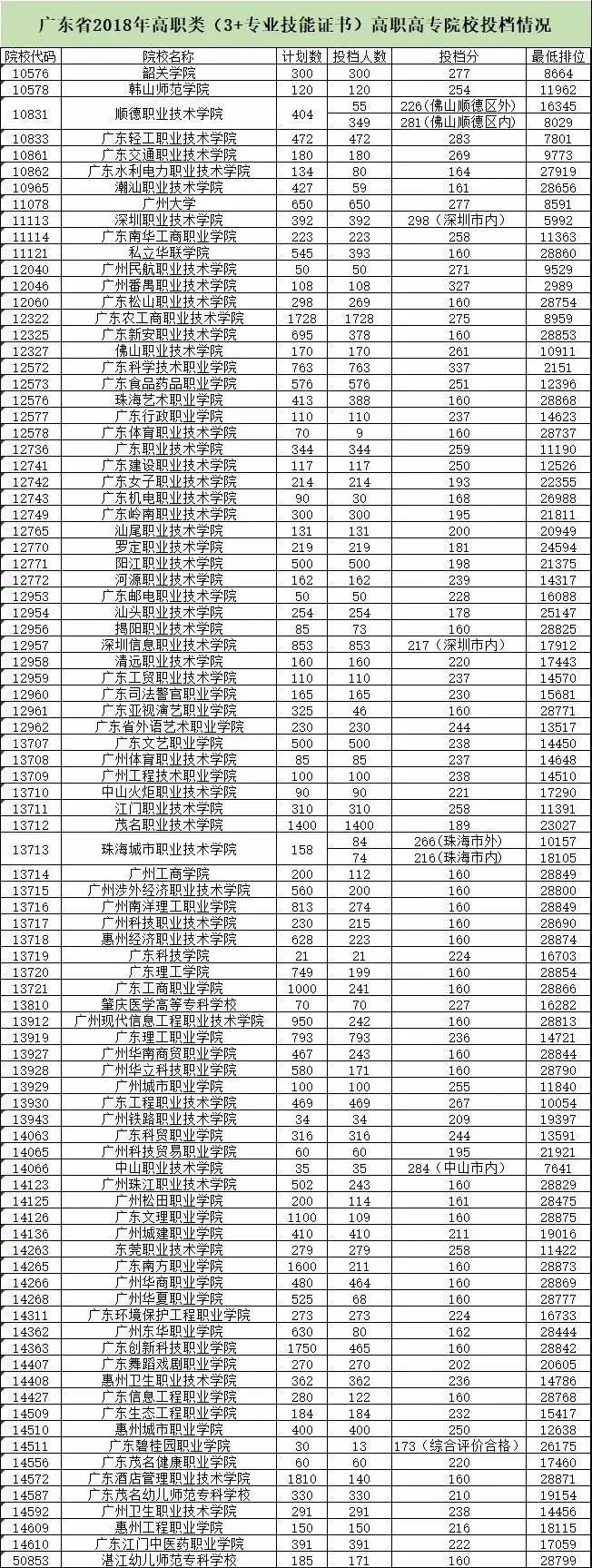 各位考生注意啦!广东省2018年“3+证书”本专科院校投档情况公布啦!