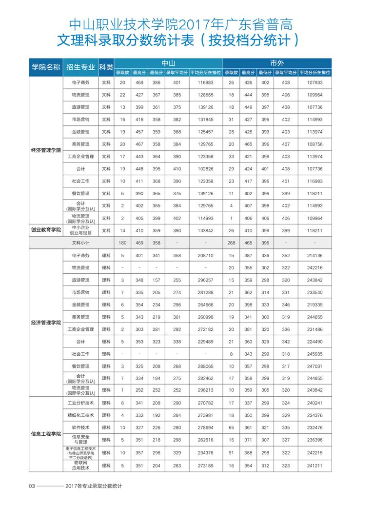 中山职业技术学院2017年各专业录取分数线(按投档分统计)