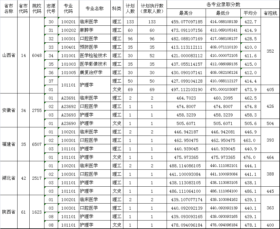 2019年山西医科大学晋祠学院在各省普通高考各专业录取分数线