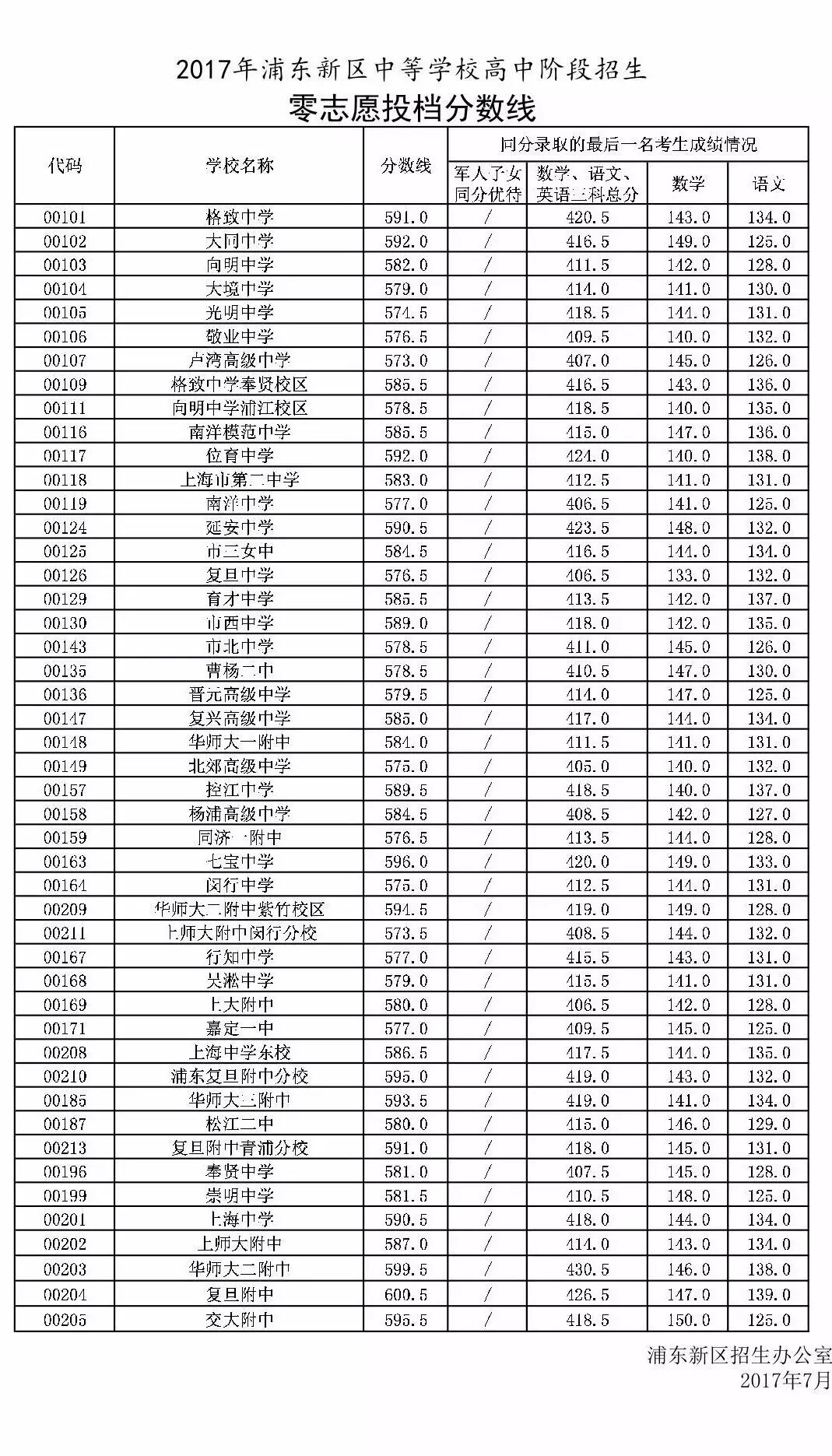 2017上海浦东中考零志愿分数线、名额分配志愿分数线