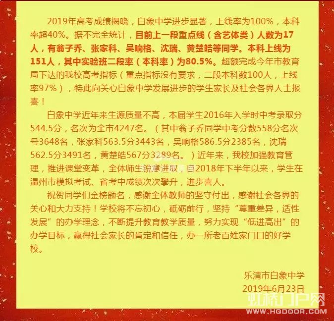 乐清白象中学2019年高考成绩喜报:一段上线17人,本科上线为151人。