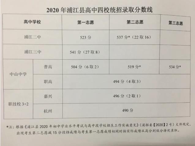 现公布浦江二中、浦江三中、中山中学、县职技校3+2录取分数线。