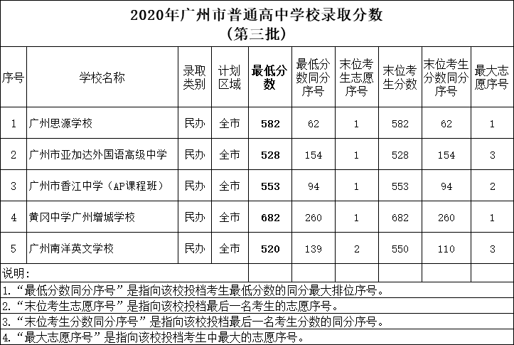 2020年广州市普通高中第三批招生学校录取工作于8月17日进行,现将录取分数公布如下: