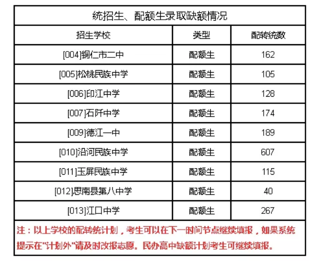 铜仁市2021年中考第三批次第一节点配额生录取情况