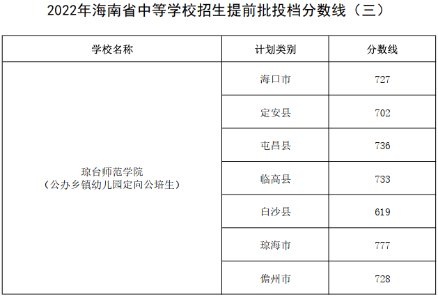 2022年海南省中等学校招生提前批投档分数线