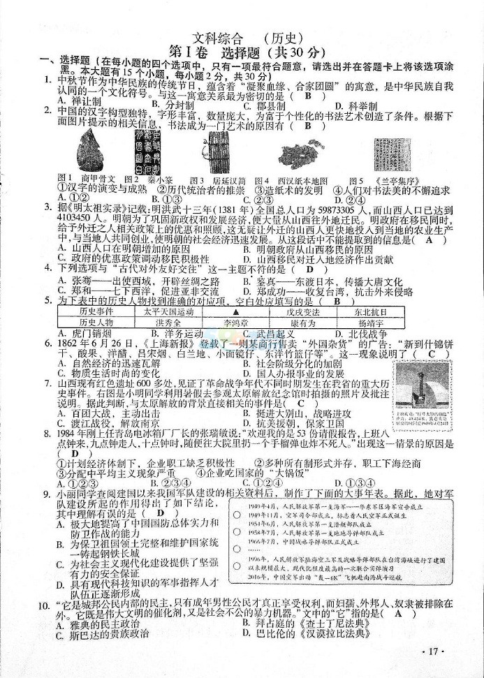 2017山西中考历史试题及答案,精英中考网消息:2017年山西省中考已经结束,六月,又有一批新的考生参加2018中考,为了帮助广大考生更好的复习备考,小编收集整理了2017山西中考各科试题及参考答案,供广大考生参考,下面是2017山西中考历史试卷及答案