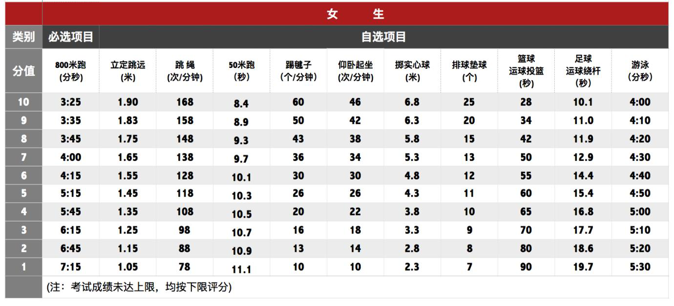 各单项成绩满分为 10 分,总分为 40 分,4 个项目按照实际测得的成绩之和计入初中毕业生学业考试成绩。成绩评定标准