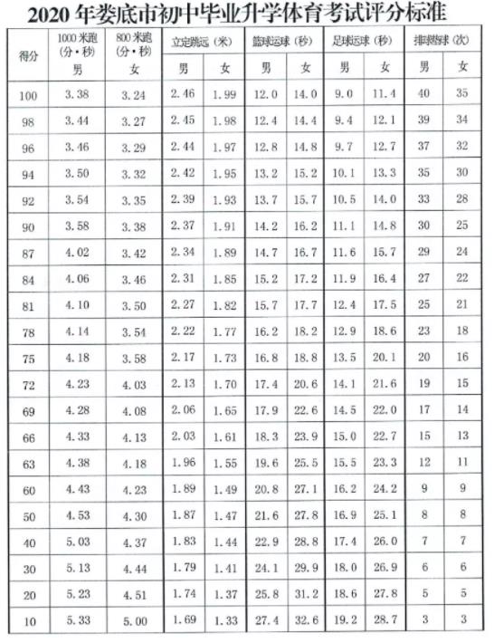 体育考试成绩统一采用国家标准计分,体育考试成绩占中考升学总成绩权重按娄底市202 0年初中毕业学业水平考试和高中阶段学校招生考试工作实施方案执行。