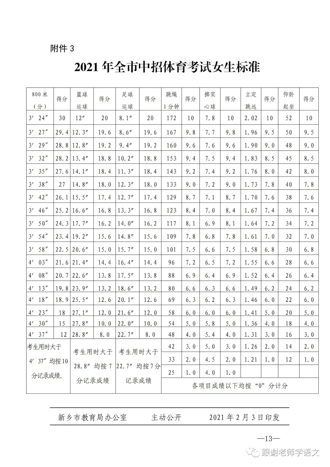 2021新乡中考体育考试评分标准