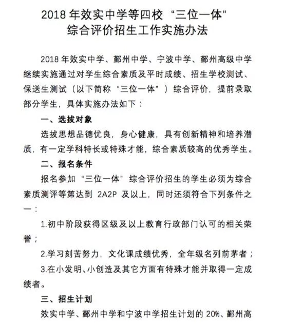 2018年效实中学等四校“三位一体”综合评价招生工作实施办法