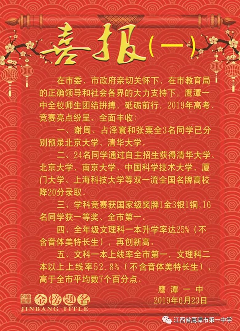 鹰潭一中2019高考成绩喜报、一本二本上线人数情况