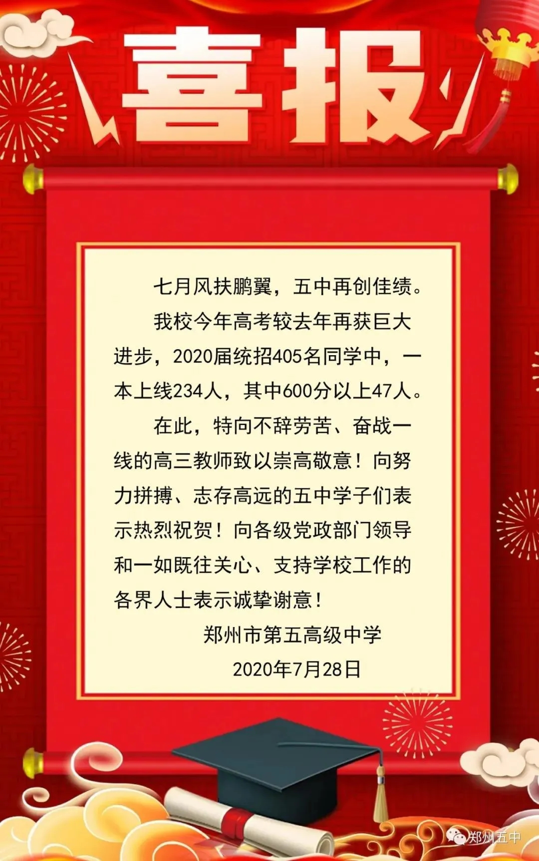 2020郑州五中高考喜报成绩、本科一本上线人数情况
