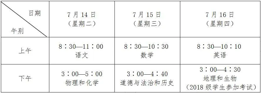 语文、数学、物理和化学、道德与法治和历史、地理和生物采用闭卷笔试的形式,其中物理和化学、道德与法治和历史、地理和生物三门考试科目的试题各分物理和化学、道德与法治和历史、地理和生物两部分,考试在同一场次合卷进行。英语考试采用闭卷笔试和听力口语自动化考试两种形式,其中听力口语自动化考试由省统一命题,其考试时间以省教育厅文件为准。