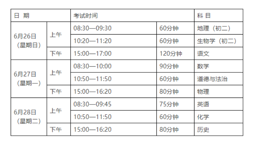 2022年东莞中考时间也定在2022年6月26日-28日三天进行,具体安排为