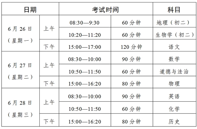 根据《广东省教育厅关于印发初中学业水平考试实施办法的通知》(粤教考〔2018〕12号)的要求,在充分征求各地市意见的基础上,经研究,现将2023年省统一命题地市的初中学业水平语文、数学、英语、道德与法治、历史、地理、物理、化学和生物学等科目考试时间安排如下: