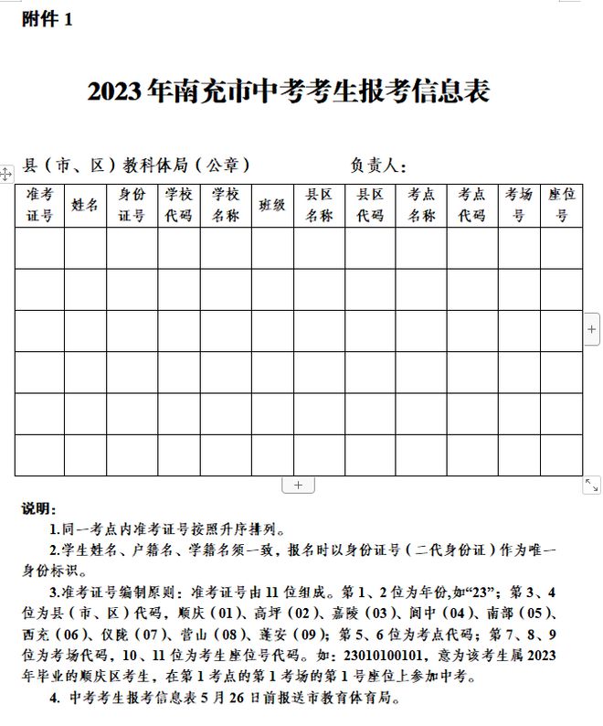 (4)生成考试信息。网上报名结束后,县(市、区)教科体局在中考网内按《2023年南充市中考考生报考信息表》(见附件1)要求生成准考证号。